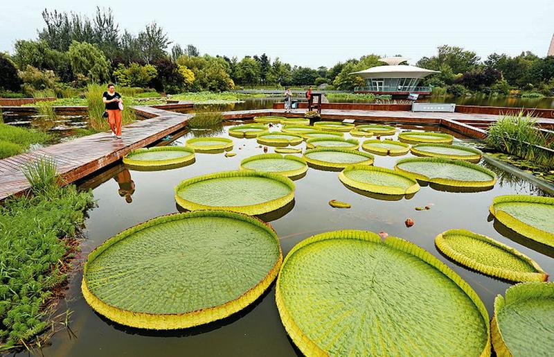 7月21日,西安植物园水景园内的水面上,铺陈着数十张硕大的王莲叶片,吸引了不少市民游客前来观赏。据悉,王莲叶片最大直径可接近3米,每个叶片最大可负重约70公斤,被称为“水中大力士”。