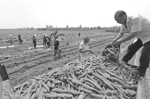 近日,大荔县韦林镇东高村股份经济合作社社员正在收获红薯。该村在壮大村集体经济带动村民增收致富中,大力发展红薯、红辣椒等,亩均年收入5000元。