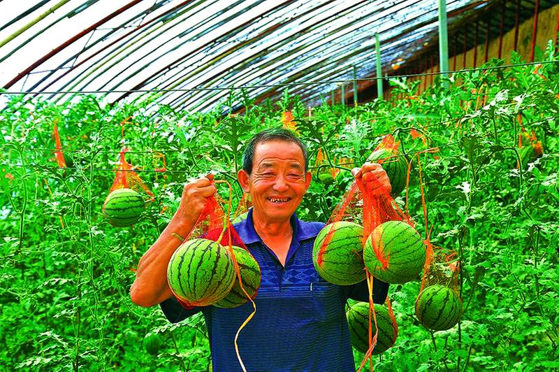 近年来,延安市吴起县王树湾村党支部流转49座日光大棚,建成“初心田园”产业教育培训基地,采取“支部+合作社+农户”“支部+大户+农户”的方式,打造“田园党建”品牌,推动集体经济快速发展,带领群众脱贫致富。图为村民王之文展示自己在田园采摘的西瓜,他家以劳务入股,预计年底可分红4万元左右。