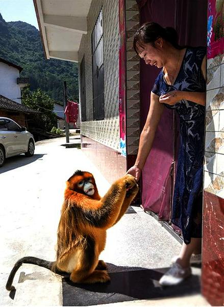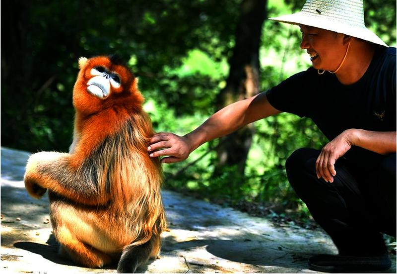 下山“串门”的金丝猴与洋县茅坪镇茅坪村的村民在一起。