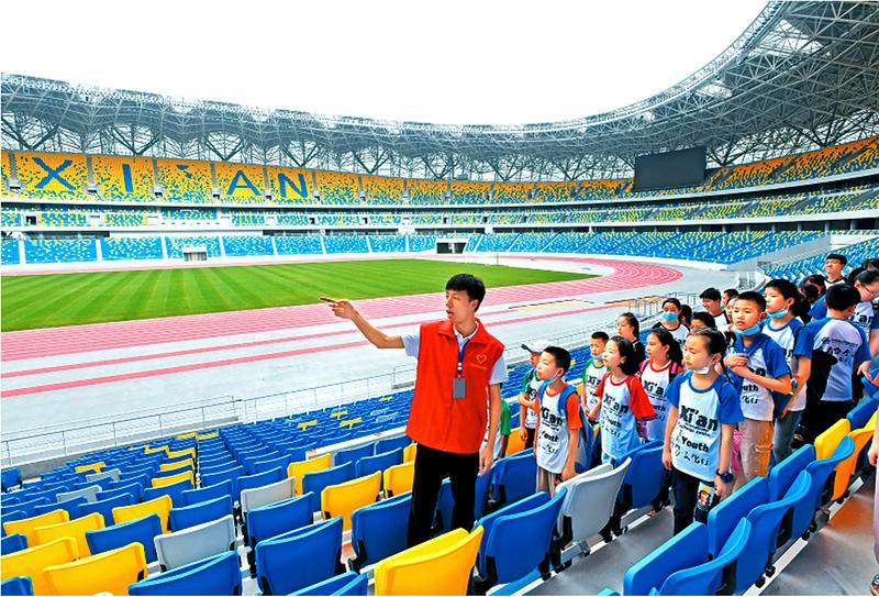 近日,由团西安市委、西安市青联主办,西安市青少年国际交流中心、周至团县委承办的“青春迎全运,文明我先行——‘小葵花’看西安”活动在奥体中心举行。来自周至县骆峪镇黄家湾社区的30余名贫困青少年参观了奥体中心的“一场两馆”。看到广阔宽敞的跑道、崭新的篮球场和游泳馆碧蓝的泳池,孩子们很兴奋。图为来自周至县的“小葵花”们在奥体中心参观。
