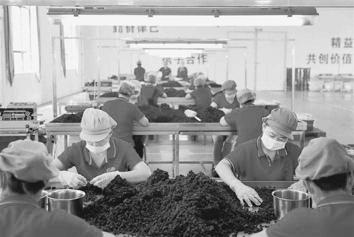 近年来,咸阳市强化扶贫导向,大力发展农村电子商务普及应用,开展代销贫困户土鸡蛋、苹果、刺绣品等各种产品业务。电子商务正在成为该市助推贫困农户增收的新业态、新模式。图为旬邑县一电子商务公司的工人在分拣干果。
