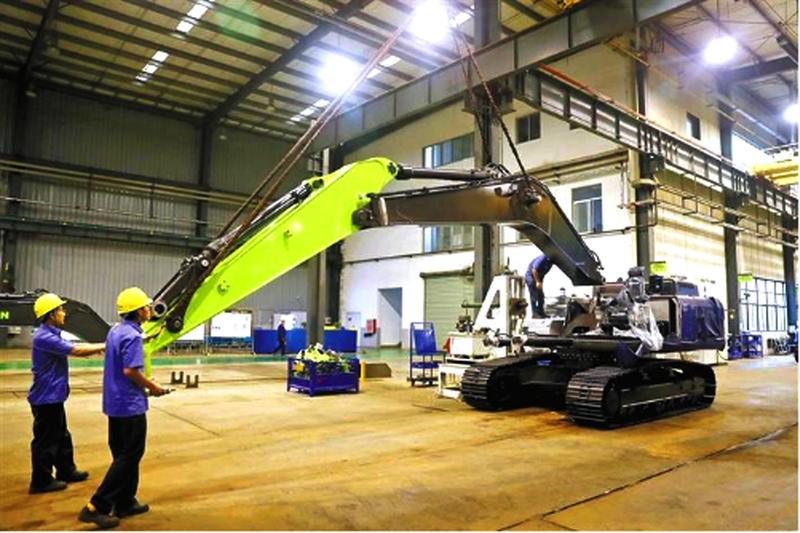 中联重科渭南工业园是中联重科股份有限公司全球唯一的土方机械生产基地,包括土方机械和建筑机械两大板块,生产的挖掘机、推土机和装载机等出口美国、加拿大、古巴等30多个国家和地区。2019年工业园实现产值14.3亿元,今年上半年实现产值17.4亿元。图为工人在车间里组装生产挖掘机。
