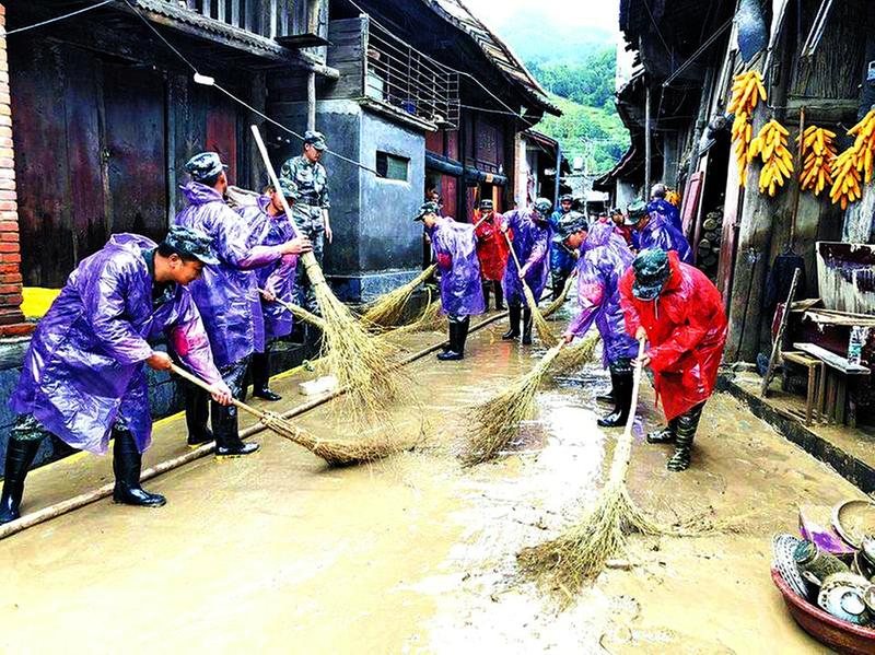 8月12日以来,宁强巨亭、阳平关等地普降大雨,导致部分商户进水,宁强县人武部集结民兵应急连120人及救援物资,奔赴灾区进行清淤作业。黎德华 摄