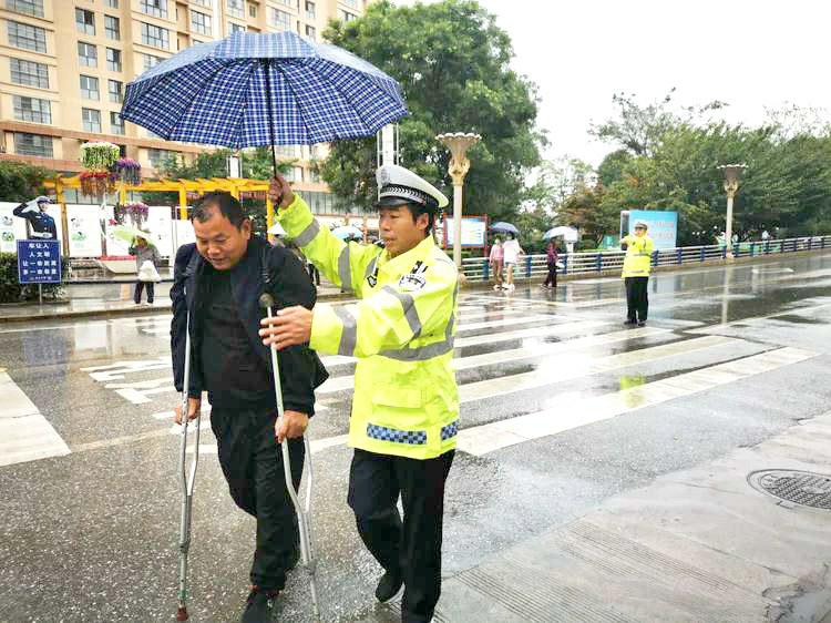 正在雨中执勤的凤县公安局交管大队城区中队中队长祝战强,遇上了拄拐前来询问凤县至宝鸡班车发车时间的凤县河口镇沙坝村群众,在告知其相关信息后,执勤交警见他独自一人拄着双拐冒雨前行,详细了解情况之后,得知他要前往宝鸡看病。见雨越下越大,考虑到受伤群众行动不便,没有陪同人员,执勤交警二话没说亲自开车将伤者送往凤县长途汽车站,在汽车站为其购买了前往宝鸡的车票,并叮嘱他路上注意安全,希望他早日康复。拿着车票的群众,看着浑身湿透的交警同志满怀感激的说:“感谢交警同志的热心相助,你们真是人民的好警察”。