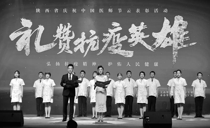 陕西省人民医院医护人员表演诗朗诵《医如人生》 本报讯(记者庞玲玲 通讯员蔡良良)8月18日下午,由陕西省卫生健康委主办、华商报社承办的“弘扬抗疫精神·护佑人民健康”陕西省庆祝中国医师节云表彰活动在西安举行。西安交大一附院主任医师马现仓等300名医务工作者被授予“三秦最美医务工作者”,陕西省支援湖北医疗队等12个团队被授予“三秦最美抗疫团队”荣誉称号。