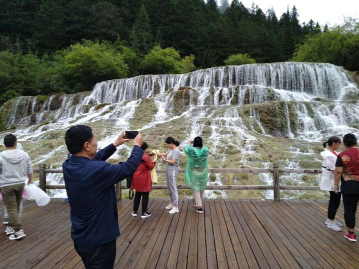 一位来自陕西游客在国家重点风景名胜区四川省黄龙风景区拍照。