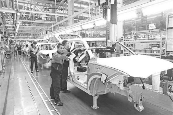 2019年,宝鸡吉利汽车部件有限公司实现工业产值121.62亿元;今年1月-7月,实现产值50.5亿元,增长8.17%。图为工人在生产线上组装乘用车。