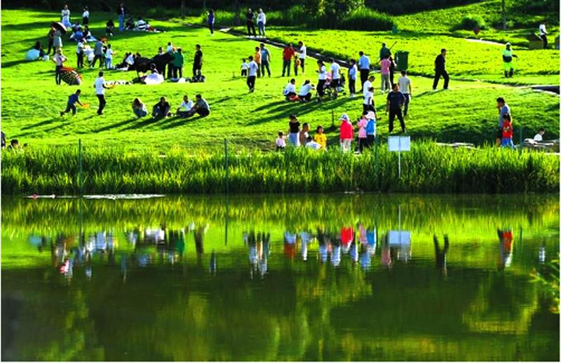 初秋时节,陕西省延安市南泥湾鲜花盛开,绿意盎然。近年来,南泥湾全力打造集革命传统教育和生态旅游于一体的“红色旅游小镇”,再现“陕北好江南”。图为游人在南泥湾景区的湿地公园游玩赏景。