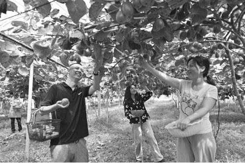 今年城固县种植猕猴桃五万亩,发展有机猕猴桃农业园区二十多个,预计产量三万吨,六千多农户在土地流转中受益,有五千多农村劳动力到园区务工。图为游客在城固县弥珍猕猴桃产业园采摘。