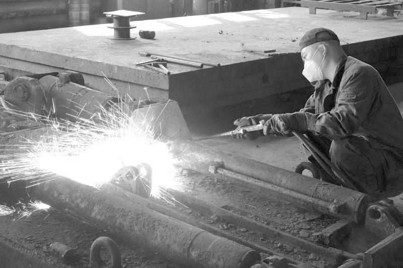 在内蒙古鄂尔多斯市巨鼎煤机实业集团有限责任公司车间内,工人在维修大型采煤机元件。贾立君 摄