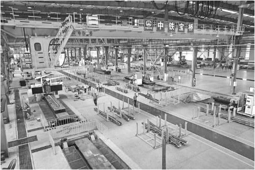 中铁宝桥高锰钢辙叉生产线,是目前国内设计产能最大,也是最环保的高锰钢辙叉专业化生产基地,年产重载高锰钢和合金钢辙叉达2万组。生产线采用最新的超强高锰钢冶炼技术,产品广泛应用于高速铁路、重载铁路、客货混跑线路、城轨交通、有轨电车线路、矿山冶金等领域,可满足国内外各种辙叉互换使用。图为近日拍摄的中铁宝桥辙叉生产线一角。