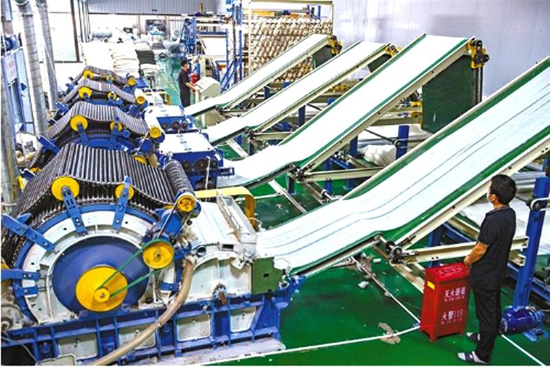 近日,在西咸新区泾河新城就业扶贫社区工厂——陕西百年新业纺织品有限公司榴棉车间,工人正在全自动有网棉胎生产线上作业。该企业是一家提供床上用品的专业化制造企业,拥有被芯整张棉自动流水线、棉花网套自动流水线设备、枕芯棉开松填充设备、多针绗缝、单针绗缝、绣花及高速平缝设备260余台套,现有300多名员工。今年1月至7月,已累计实现产值1885万元。