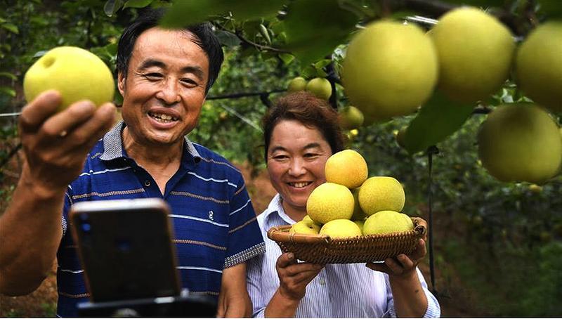 目前,洋县已先后扶持发展有机生产企业30户,认证有机产品15大类81种14.29万亩,年产值超过11亿元。全县通过实施有机种养殖,约10万农民享受着有机产业发展带来的红利,其人均纯收入高出全县平均水平1500元以上。图为洋县纸坊街道草坝村刘小刚夫妇在黄金梨园里直播。