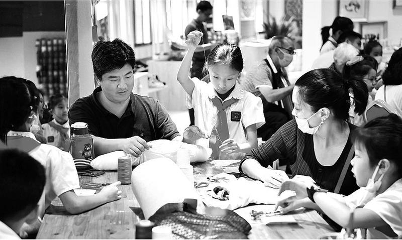9月5日,西安市雁塔区翠华路小学(长大校区)的三年级小朋友和家长共50余人走进陕西省妇女儿童活动中心,为山区留守儿童制作抱枕,献上自己的一份爱心。图为小朋友与家长一起制作抱枕。