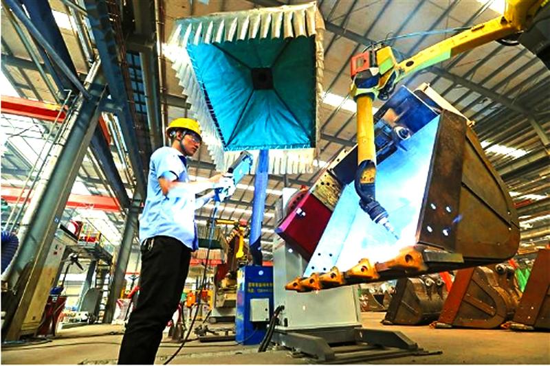 陕西西部重工有限公司是专业研发、生产各类机械产品结构件的制造商,主导产品是推土机、挖掘机、起重机、重型汽车部品,占各主机厂产品采购份额的80%—93%。今年该公司克服各种困难,产能比去年同期增长30%。图为机器人在焊接挖掘机的铲斗。