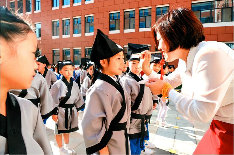 9月7日,在西安市浐灞第十七小学,一年级新生穿着改良后的汉服,怀揣着对中华传统文化的敬畏之心,完成了一场别开生面的新生开笔礼仪式。图为老师们为一年级新生点朱砂,并送上新学期的祝福。