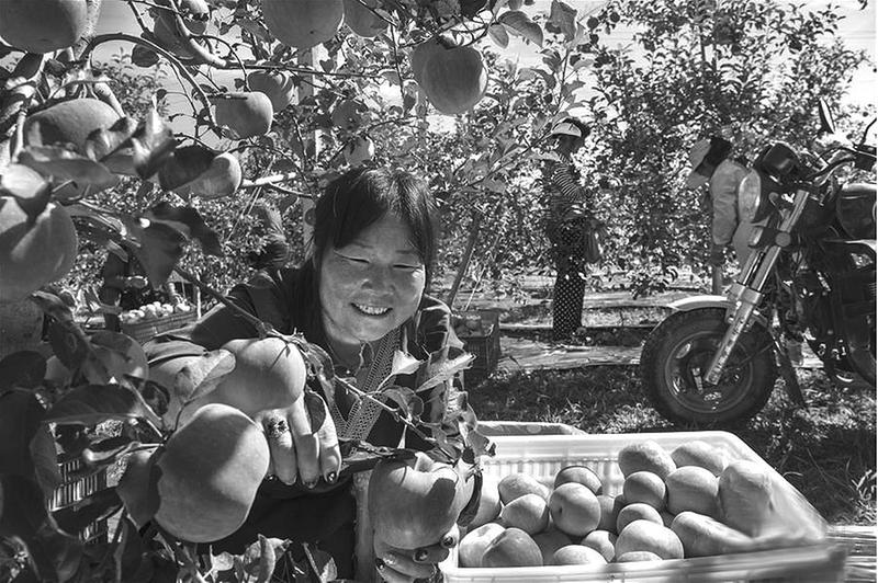 近年来,位于黄土高坡的陕西省白水县为促进苹果产业转型升级,依托西北农林科技大学白水苹果试验站的科技优势,自主培育出“瑞阳”“瑞雪”等拥有自主产权的苹果新品种,同时革新栽植模式,推广旱地矮化密植高效栽培、老果园技术改造和绿色有机生产技术,探索并形成了富有白水特色的果园托管模式,当地出现的一批新型果农正成为苹果产业的主力军。图为该县林皋镇北马村的林秋芳在自家的苹果园里采摘早熟的富士苹果。
