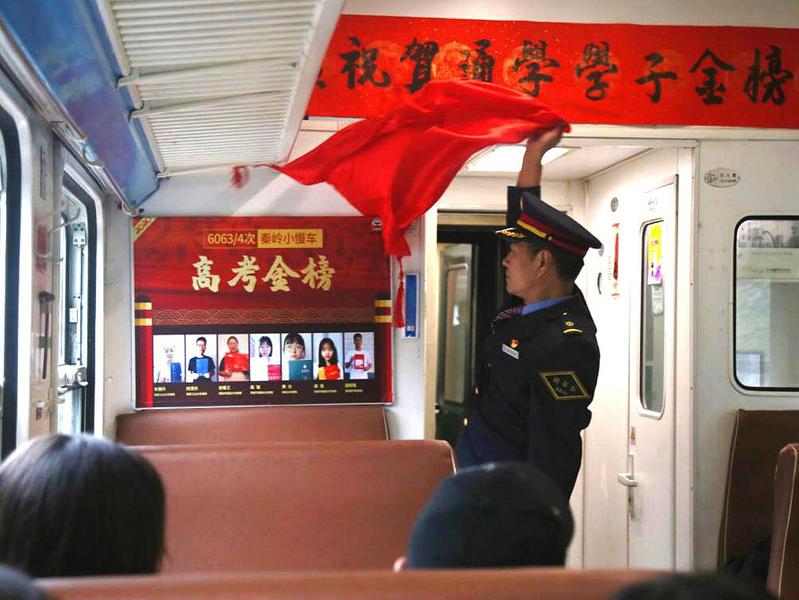 “孩子们,今年我们小慢车的通学学生里,有7人考上了大学,现在让我们揭开‘高考金榜’,一起来看看他们都是谁。”略阳前最后一个通学车站——马蹄湾站开车后,6063次列车长向宝林一边说着一边挥手掀开了红绸,只见一张红纸金字的“高考金榜”展现在所有人眼前,上面7名“准大学生”拿着录取通知书喜笑颜开的照片吸引了所有人的注意。