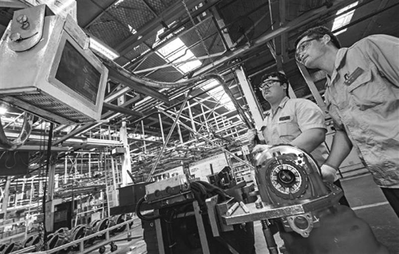 近日,在陕西汉德车桥有限公司西安工厂二期车间装配生产线上,工人在检测产品。截至目前,该公司今年生产各类桥总成74万根,同比增长39%。
