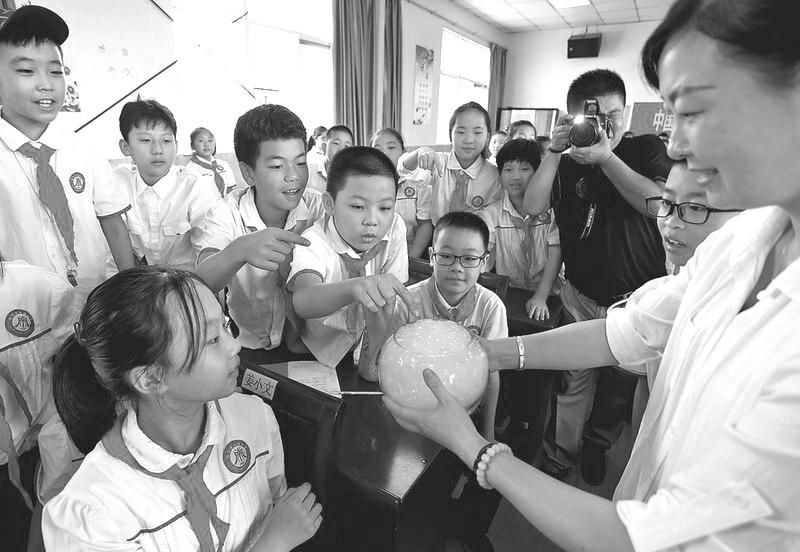近日,渭南市2020年全国科普日“大手拉小手”科普实验巡回展演活动启动。渭南市科协邀请中科院陕西分院青年科普团走进南塘小学,以科学实验的方式让学生近距离感受科学的奥秘,激发他们的学习兴趣。图为渭南城区南塘小学学生正在体验液氮蘑菇云实验。