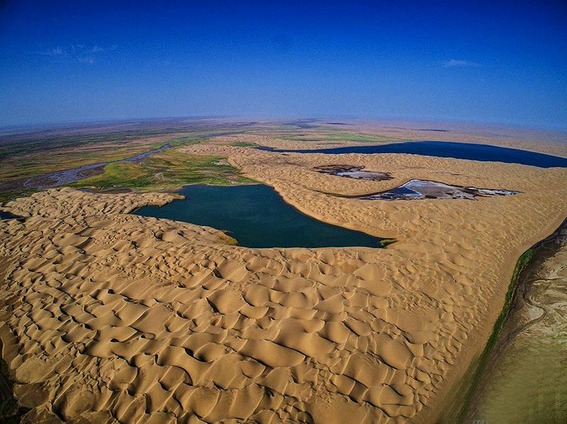初秋时节,汛期尚未到来,康拉克湖宛如一颗遗留在沙海中的明珠,黄沙、芦苇、水光相互辉映,安详静谧。