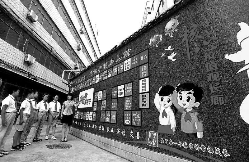 近年来,渭南市各中小学、幼儿园深入开展社会主义核心价值观进校园活动,充分发挥校园党史长廊、橱窗、展板、教室等教育阵地的作用,营造浓厚的学习氛围,使社会主义核心价值观在潜移默化中融入师生学习生活。图为老师向学生讲解社会主义核心价值观的内涵。