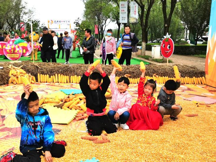 农民节现场举行的剥玉米比赛,小朋友正在展示自己的玉米