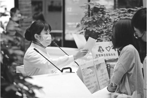 10月6日,在西安交通大学第一附属医院,门诊部导医陈姿合正在为就诊人员提供咨询服务,节日期间她每天接受问询近万次。