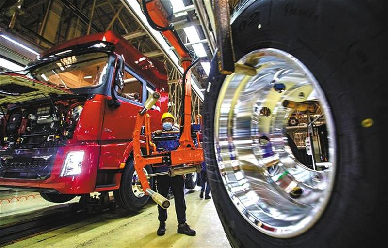 今年前三季度,陕汽控股累计生产各类商用车17.7万辆,同比增长25%,累计销售17.3万辆,同比增长24%。图为工作人员在陕汽控股西安商用车产业园重卡总装线上忙碌着。