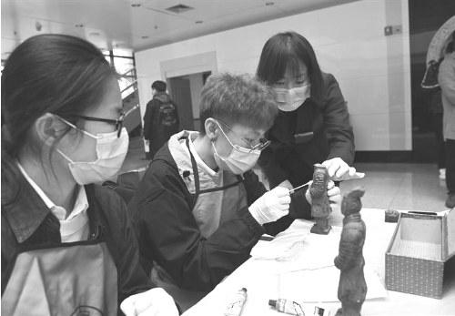 近日,西北大学文化遗产学院2020级新生“开学第一课”,在秦始皇帝陵博物院开课。这是国内首次将高校新生开学课堂放在文化遗产地与博物馆。图为同学们在体验博物院品牌教育活动“我是文物修复师——学修兵马俑”。