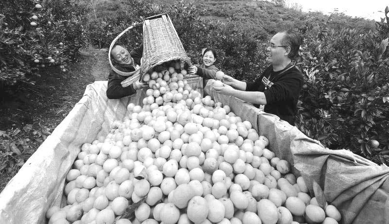汉台区汉王镇积极发展以汉王柑橘为代表的特色农业产业,种植规模达1.8万亩,柑橘成为带动村民增收致富的“黄金果”。图为村民们在橘园收集转运成熟的柑橘。崔建荣 摄