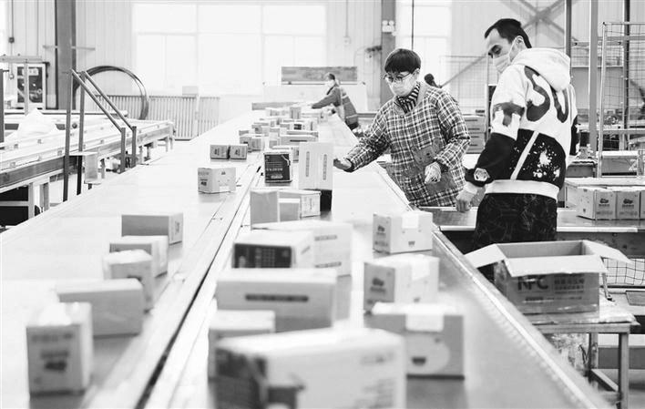 近年来,咸阳市持续加强政策扶持,不断完善电子商务公共服务平台和基础设施建设,有效推进全市电子商务高质量高水平发展。图为武功县陕西美农网络科技有限公司分拣中心的工作人员正在作业。王晓田 摄