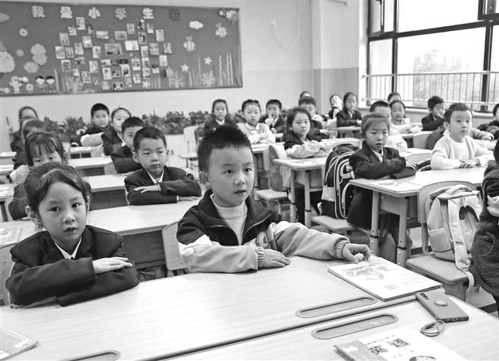西安高新区第十七小学一年级8班学生在窗明几净的教室里上课。