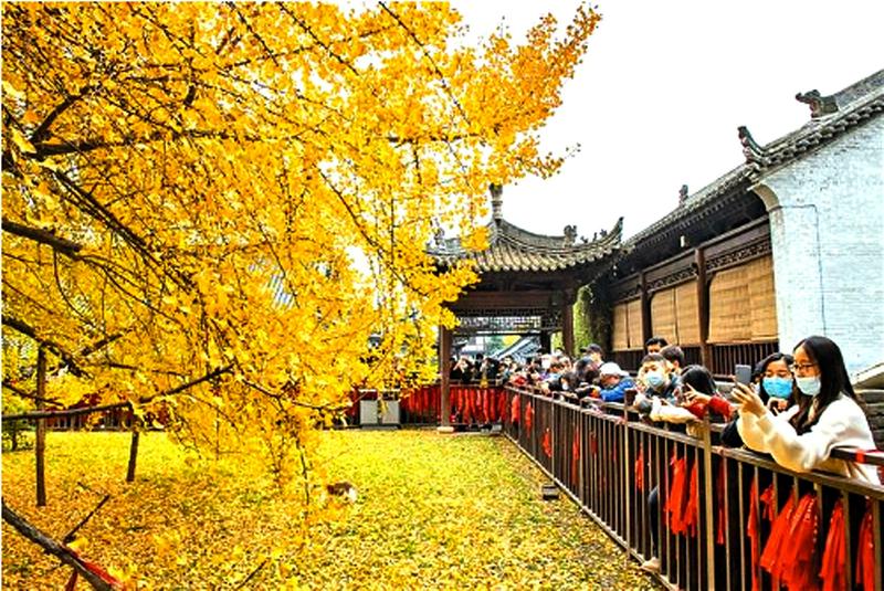 深秋时节,古观音禅寺内的千年银杏树一片金黄,遍地落叶宛如金色地毯。目前,西安古观音禅寺千年银杏进入观赏期,免费预约每日限额3000人。位于西安市长安区罗汉洞村的古观音禅寺始建于唐贞观年间(公元628年),距今约有1400年历史,为终南山千年古刹之一。图为游客在观赏千年银杏树。袁景智 摄