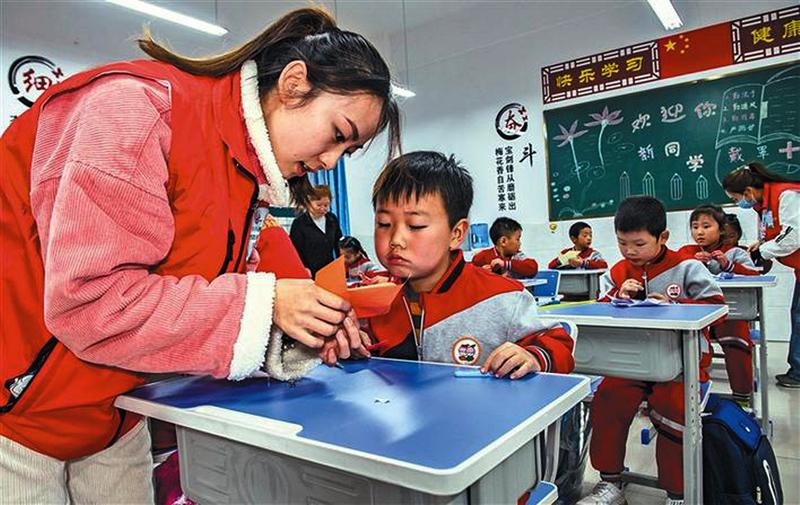 近日,中天西北集团爱心志愿者给学生们教手工折纸。当日,由西安市人社局、中天西北集团联办的“丝路·美好生活+”公益计划之“南德小学结对帮扶圆梦行动”走进大荔县羌白镇南德小学。爱心单位向南德小学捐赠了价值20万元的幼儿园大型玩具幼儿床、教学多媒体电脑、打印机、小学课桌文具等教学设备和物资,爱心志愿者和学生们在课间进行了唱歌等互动活动。袁景智 摄