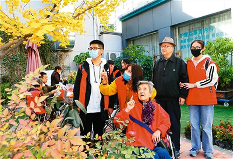 据悉,此次活动由碑林区委文明办、西安市小火柴公益中心联合举办。图为志愿者带着护理院的老人们欣赏秋日美景。李明 摄