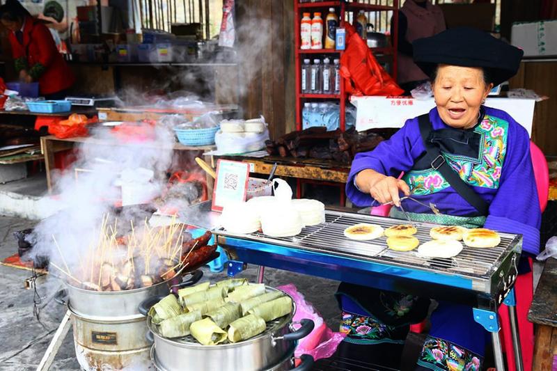 路边穿着苗服卖糍粑的老人、刻着“精准扶贫”字眼的石头、独具特色的木质结构房屋、被总书记亲切称为“大姐”的石爬专……无一不吸引着大家的目光,纷纷与其合影留念。