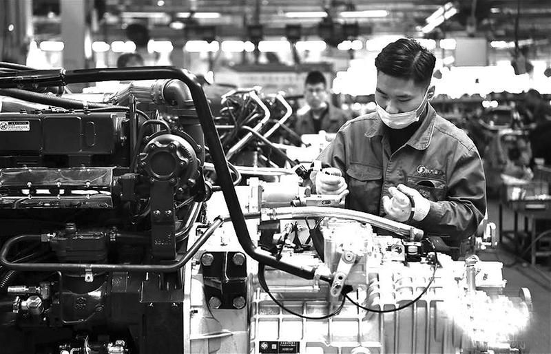 在位于西安的陕西汽车控股集团有限公司总装车间,工人在生产线上作业。刘潇 摄