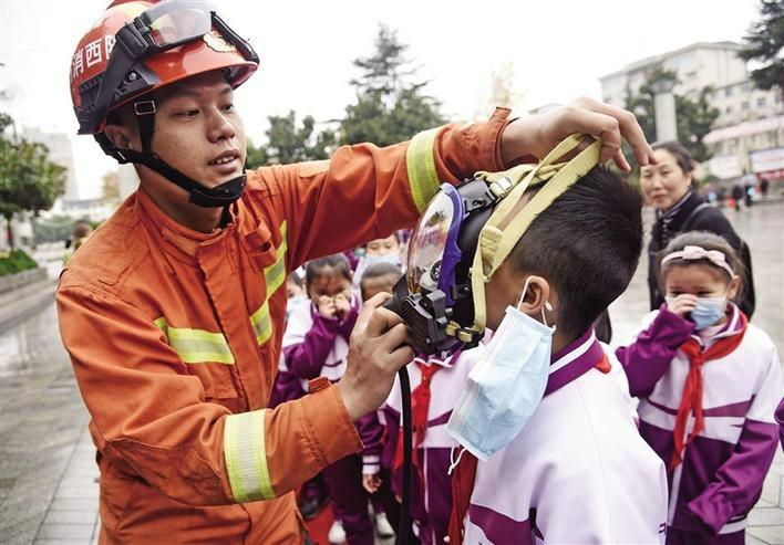 消防救援人员教宁强县北关小学学生戴消防氧气罩。