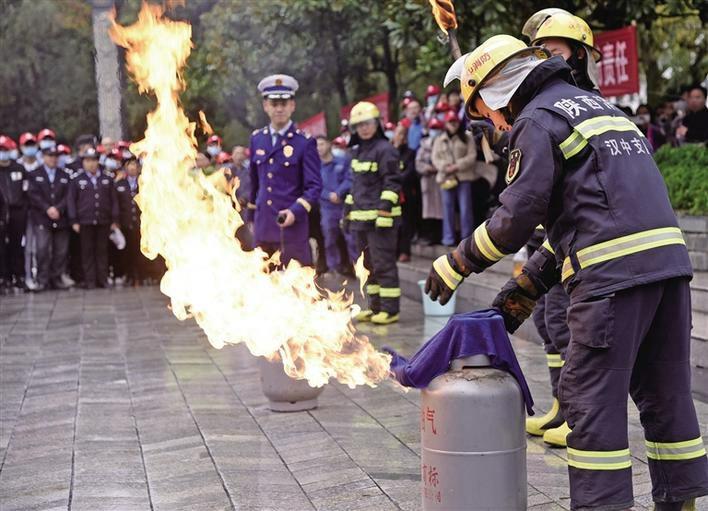 11月3日,汉中市宁强县举行“119消防宣传月”启动仪式,消防救援人员现场为群众展示消防救援器材,教会群众使用水、消防毯、灭火器等消防物品扑灭油锅着火、煤气罐着火等家庭常见火灾的自救方法。黎德华