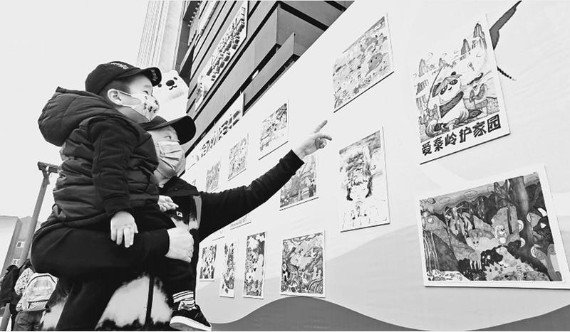 为加快“推进绿色发展、建设生态西安”重点工作深入开展,西安市碑林区以“秦岭生态保护”为主题开展了系列宣传活动,在全区范围内开展了征文、绘画、视频作品评比活动。图为优秀作品引来参观者驻足观看。冯炜 摄