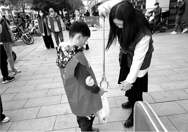 11月14日,志愿者们和小朋友一起参加了捡烟头等志愿服务活动,以实际行动倡导绿化环保。李安定 摄