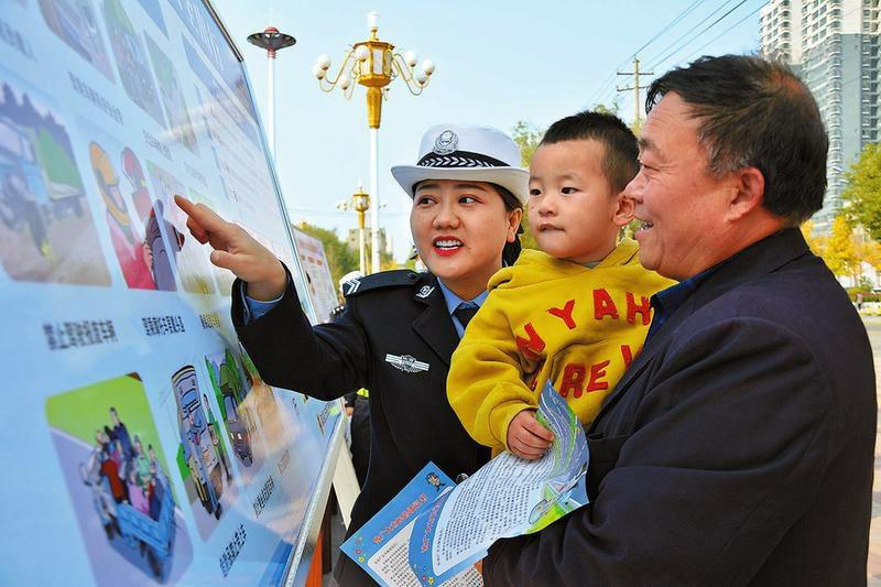 近日,蒲城县公安局交通管理大队围绕122主题“知危险会避险安全文明出行”组织开展“一盔一带”交通安全守护行动集中宣传活动,进一步提升群众安全出行的意识,筑牢安全防线。图为蒲城县中心广场,民警向群众宣传安全出行知识。崔正博 摄