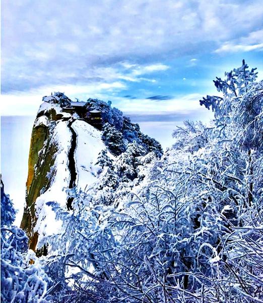 11月23日,华山景区被积雪覆盖,银装素裹,分外美丽,为游客送来“冬天的热情”。景区工作人员也在第一时间清理景区道路及座椅等公共设施上的积雪,以确保游客安全。图为拍摄的华山一角。戴吉坤 摄