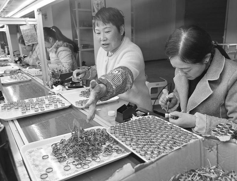 为增强贫困群众产业发展能力,江苏崇川区帮助宁强县实施苏陕扶贫协作项目一百三十三个,已完成投资三点六亿元,惠及贫困人口两万余人。图为该县铁锁关镇的贫困户在苏陕协作社区电子工厂加工电子配件。刘炳林 摄