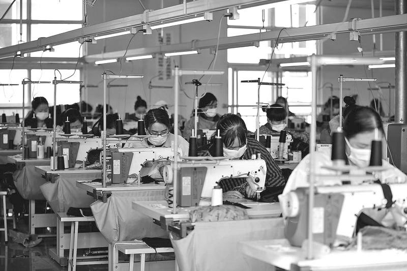 澄城县嘉成服饰加工厂为2020年度苏陕扶贫协作项目,7月建成投产,解决当地160人就业,将带动贫困户200户837人长期稳定受益。目前,成衣制品主要销往上海等一线城市。图为近日,澄城县嘉成服饰加工厂扶贫车间内,工人正在赶制订单。 雷沛 摄
