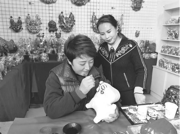 敬萍(右)指导胡玉洁给泥塑上色。 擀泥饼、入模具、上白粉……一块泥巴,经过揉、搓、拍等工序,再加上各种工具的塑形、雕刻,一个活灵活现的泥塑作品便呈现出来。“你看,这一上色泥塑是不是就变得更加鲜活了?泥塑这东西啊,得慢慢来,慢工出细活……”11月11日,陕西省人大代表、凤翔县西府巧女手工艺品专业合作社理事长敬萍一边给泥塑上色一边说。