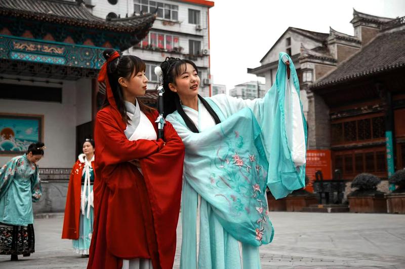 活动在悠扬婉转的乐声中拉开了序幕。同袍们身着不同品牌、不同风格的传统汉服,有的拱手作揖,举手投足间洋溢着风华韵味;有的广袖翩翩,轻歌曼舞间展现灵动婀娜。千年汉服与百年街区相映成趣,成为冬日里的一道美丽的风景线,过往的游客和观众们沉浸于华美的古风气息之中,领略着汉服与石泉老街历史之间的融合之美。