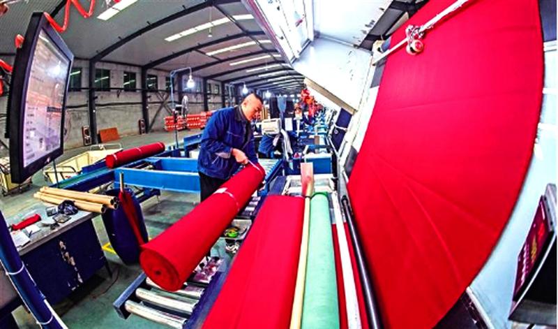 陕西兴洲纺织科技有限公司是一家以纺织印染产业为主,多元化拓展的股份制企业。企业现拥有4条染色生产线、3条印花生产线,年产各类高档服装面料5000万米。其中,印花面料2000万米,多功能服装面料3000万米。今年,该企业克服疫情带来的不利影响,前11月累计生产各类高档服装面料3200万米,实现产值2.25亿元,出口创汇780万美元。图为在染色车间,工人正使用成品验卷机卷布。袁景智 摄